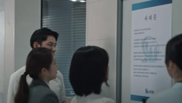 감사합니다 6회에서 한수는 직원들이 누구가 신고할 수 있도록 대자부를 붙입니다.
