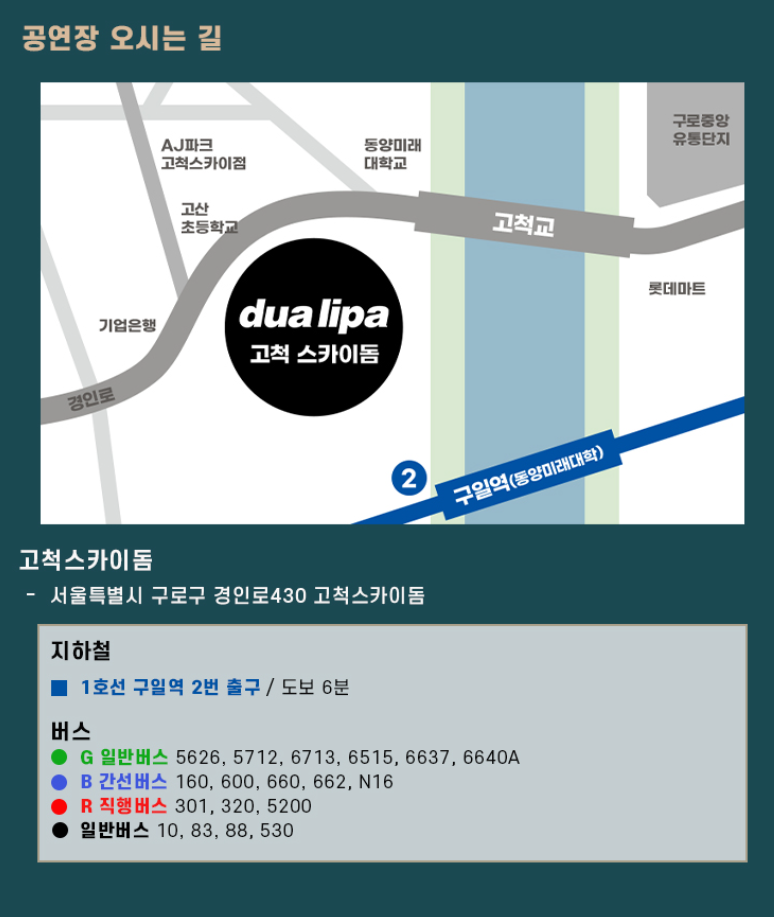 1) 두아 리파 내한 공연장소는 고척스카이돔에서 진행된다고 합니다.
