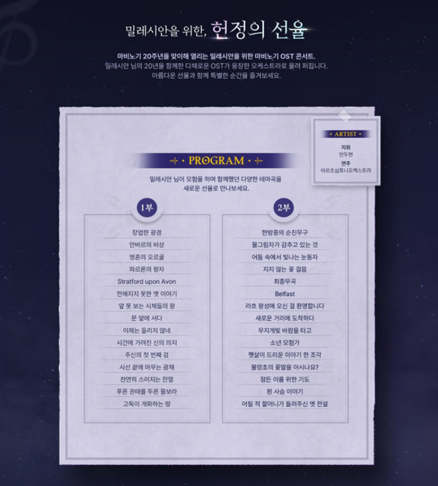 | 마비노기 20주년 오케스타 콘서트 서울 | 2024년 6월 23일 일요일 오후5시 | 서울 롯데 콘서트홀 |