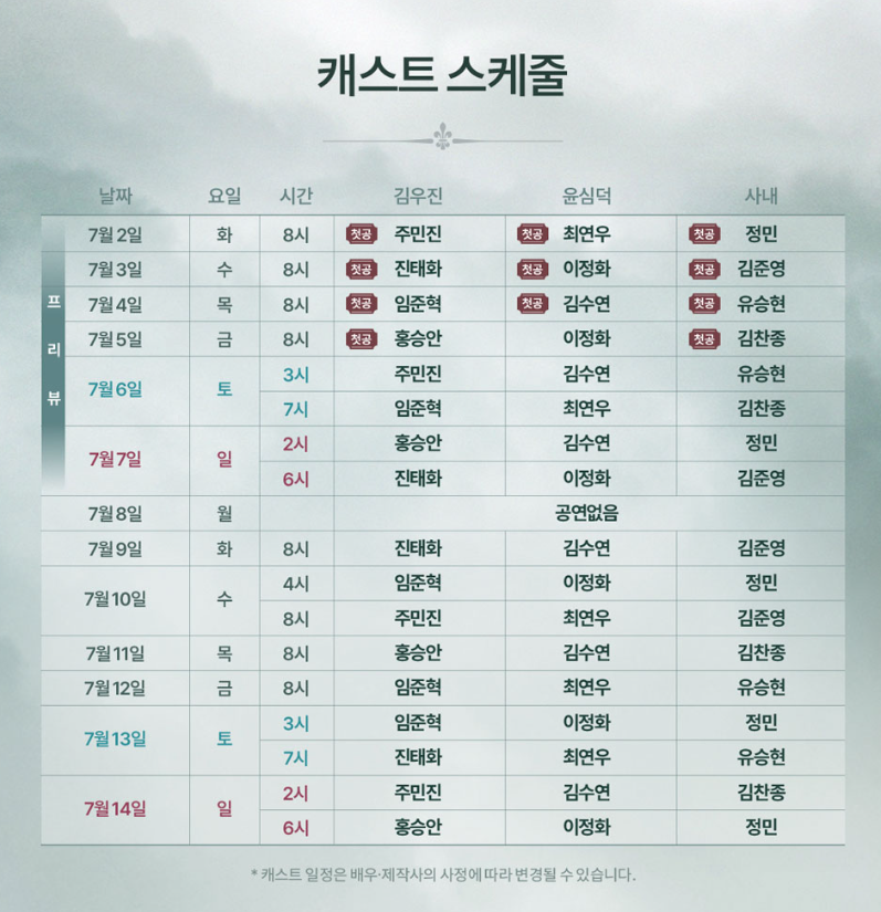 캐스트 스케줄은 배우 및 제작사의 사정에 의해 사전 공지 없이 변경될 수 있다고 합니다.
