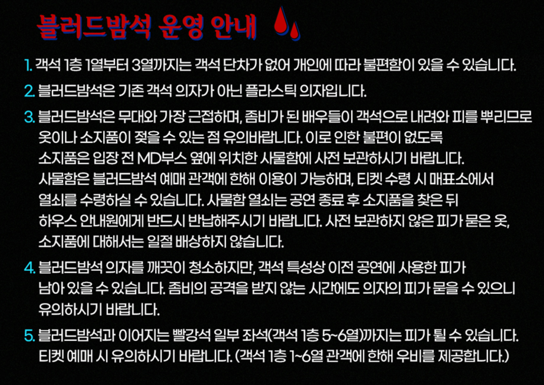 B급 코미디 좀비 뮤지컬이라는 독특한 장르로 큰 인기를 끌었으며, '블러드밤석'은 좀비가 된 배우들이 객석으로 내려와 피를 뿌리므로 옷이나 소지품이 젖을 수 있다고 합니다.