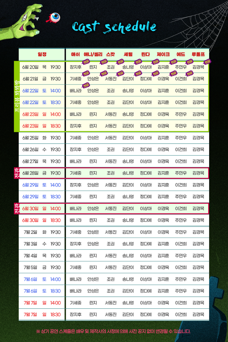 캐스트 스케줄은 배우 및 제작사의 사정에 의해 사전 공지 없이 변경될 수 있다고 합니다.