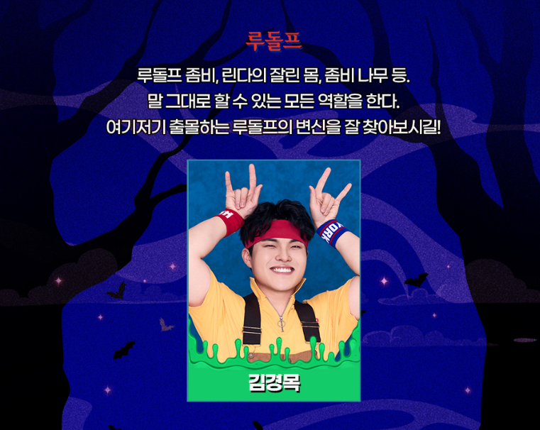 루돌피 좀비, 린다의 잘린 몸, 좀비 나무 등 말 그대로 할 수 있는 모든 역할을 한다고 합니다. 여기저기 출몰하는 루돌프의 변신을 한다고 합니다. 출연지은 김경목입니다.