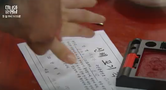 미자에게 깡패들이 돈 갚으라고 말합니다. 신체포기각서에서 도장 찍으라고 합니다.
