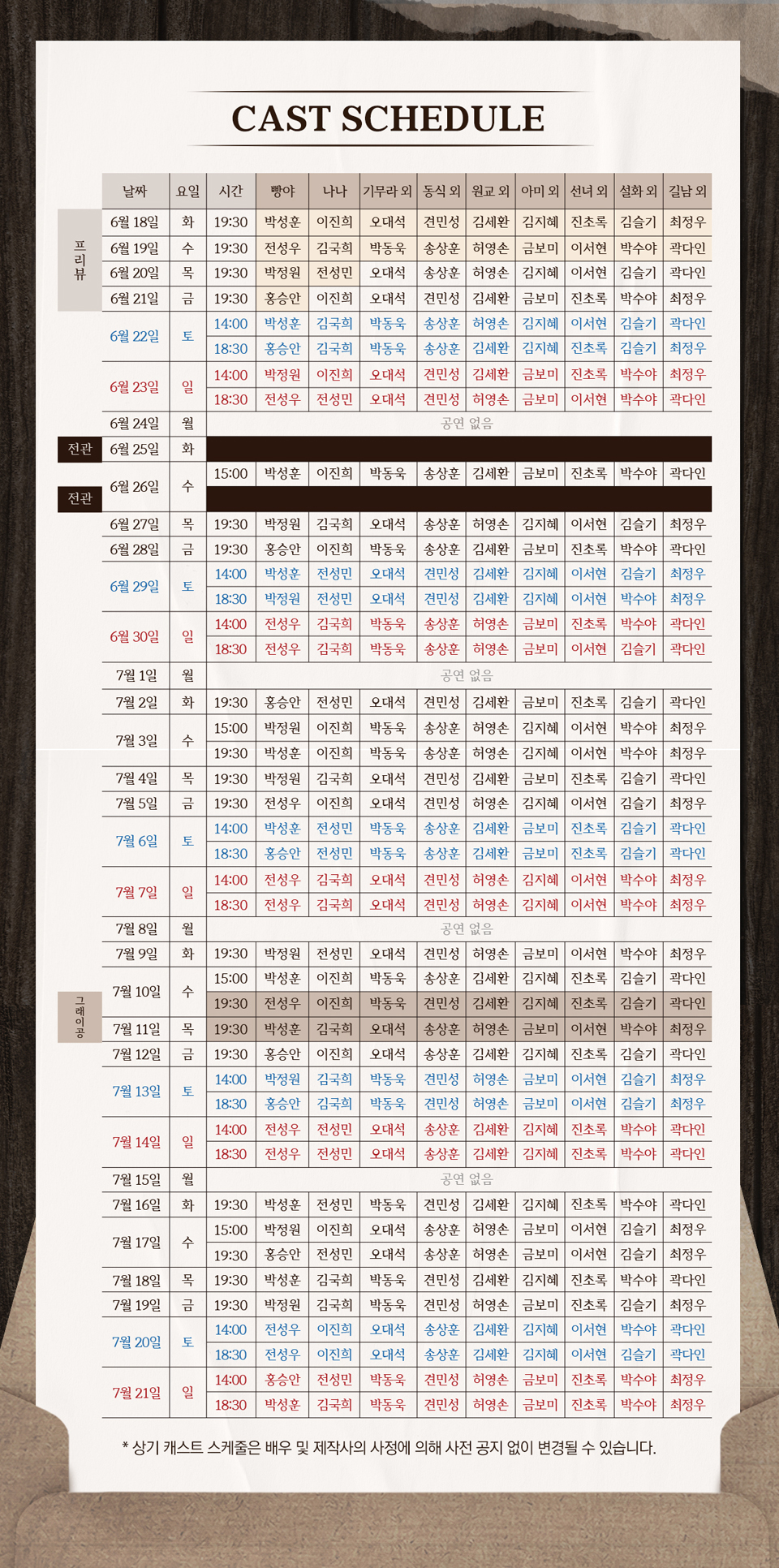 캐스트 스케줄은 배우 및 제작사의 사정에 의해 사전 공지 없이 변경될 수 있다고 합니다.
