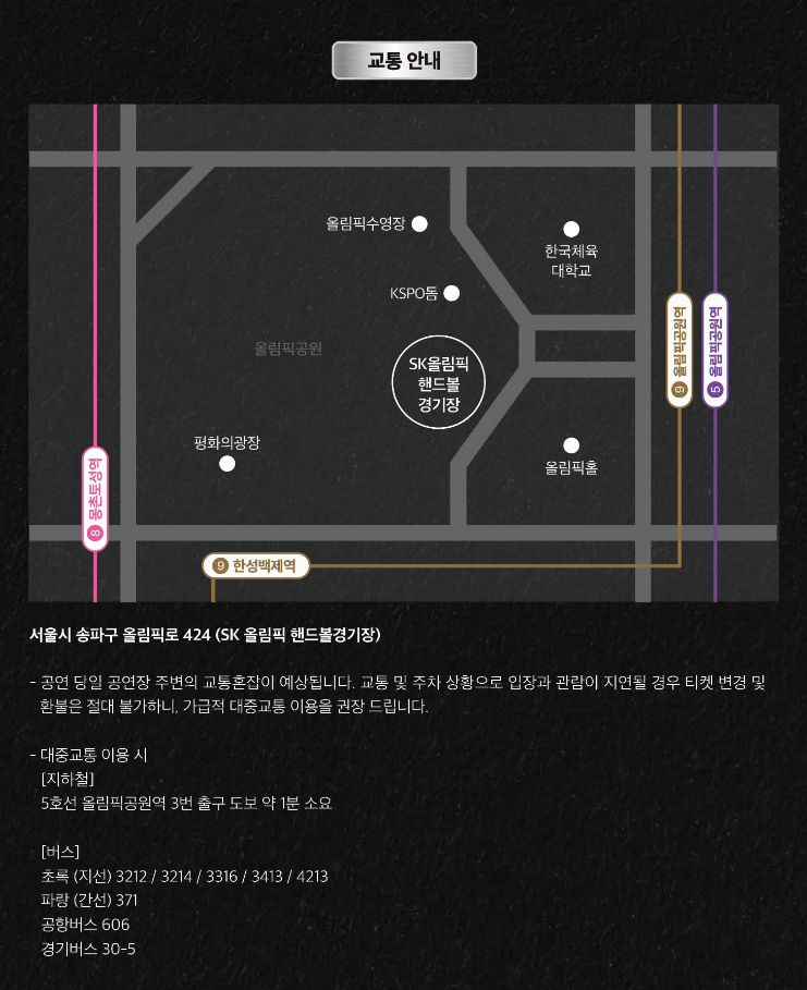 - 공연장소와 시간은 sk 올림필 핸드볼 경기장이며 2024년 7월 6일 토요일 오후 6시입니다.