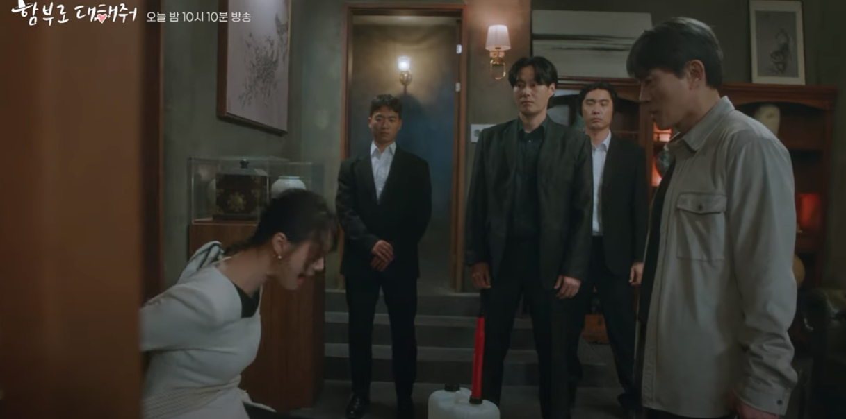 함부로 대해줘 16회에서 이범교는 윤복이 찾아오자 자신의 은신처를 불로 지르려고 기름을 붓는데요.